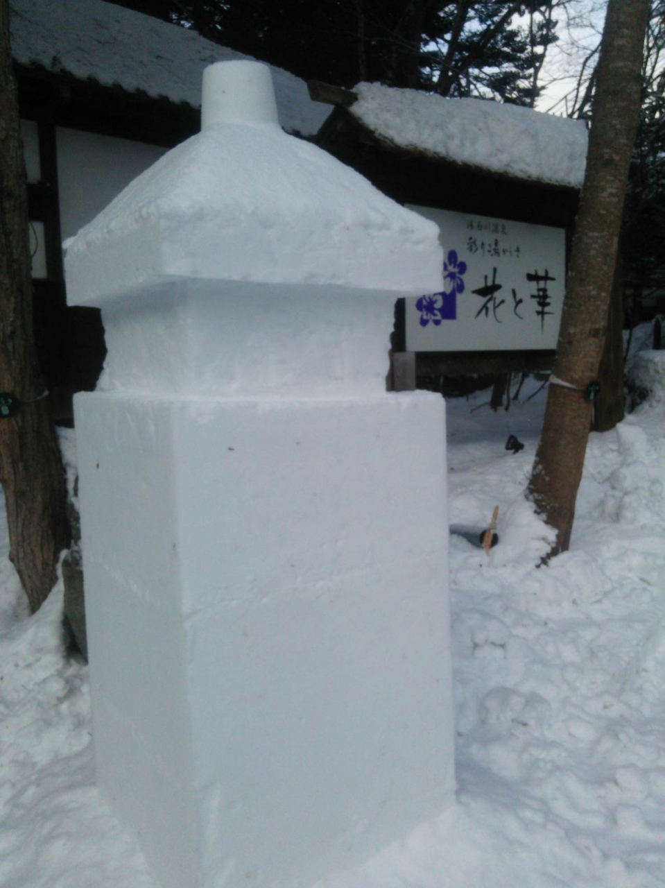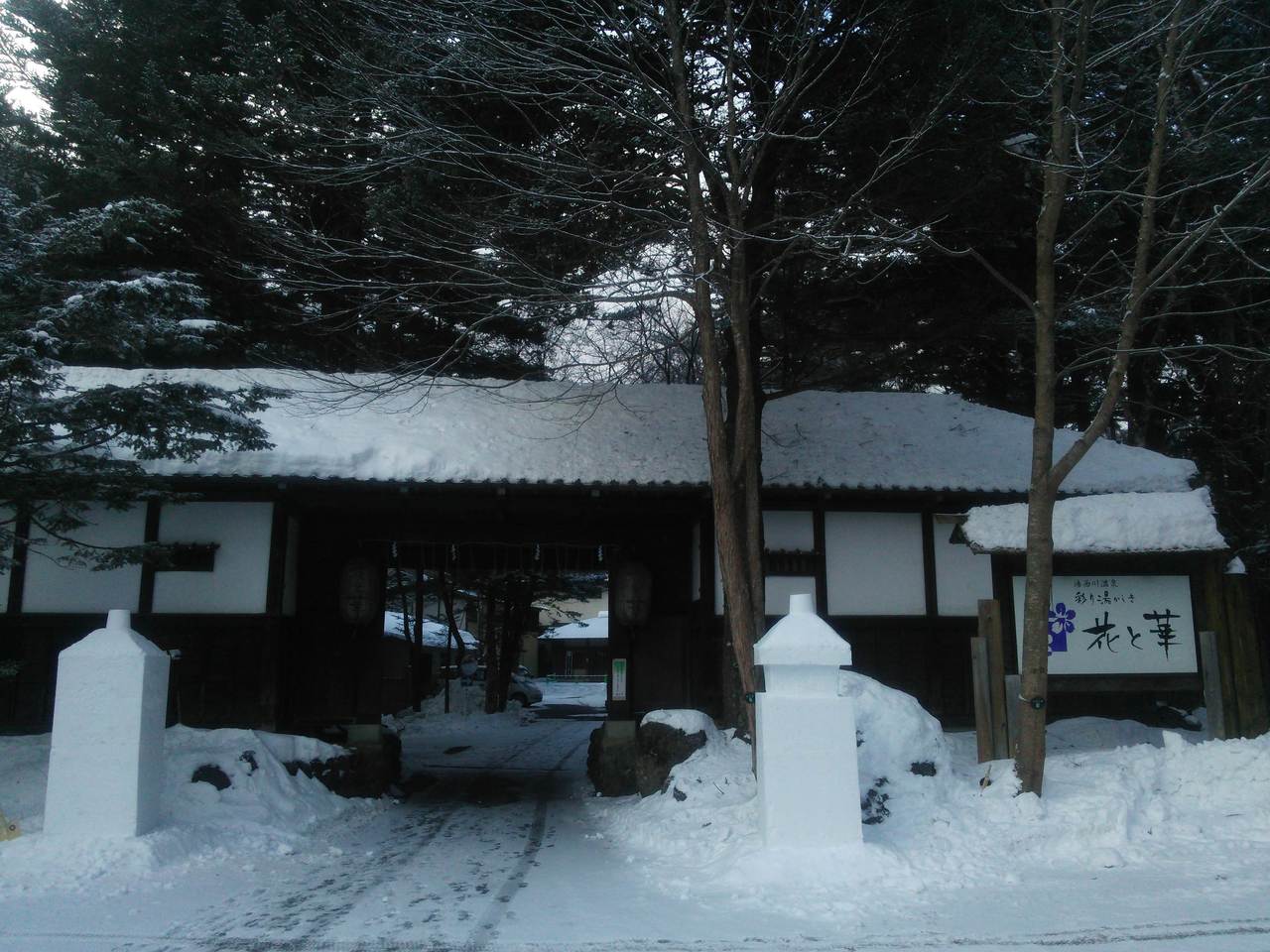 道路から左ななめに立派な門が建っていて、また冬のシーズンなので手作りの雪の門柱もあり、素敵でした。