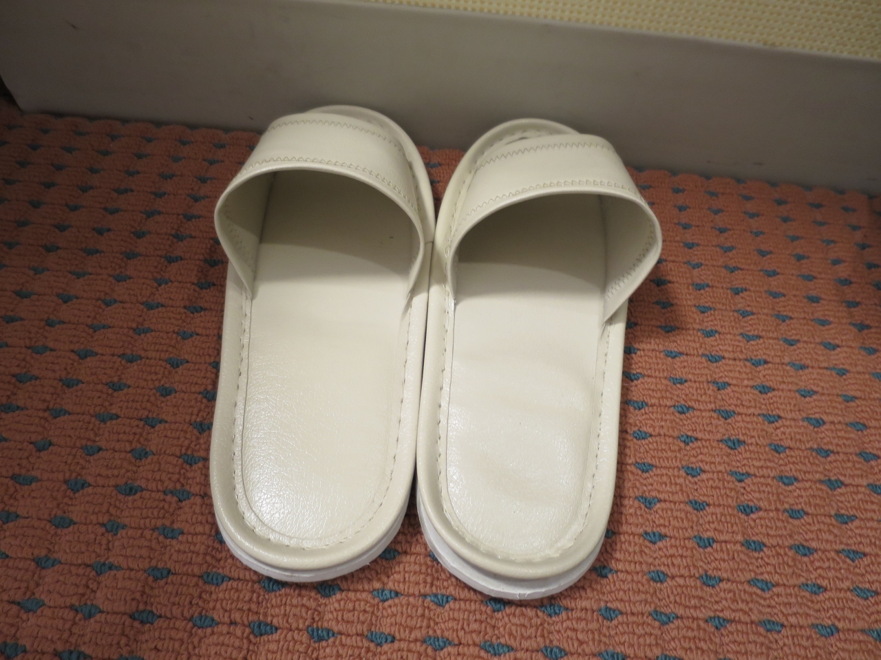 客室にあるスリッパは使い捨て式ではなく消毒後に繰り返し使用するタイプの物です。地球環境を考えると無駄のない方式であるとはわかっていても、どうしても材質上肌にまとわりつくようなペタペタ感があるので、特に風呂上がりなどは少々不快に感じてしまいます。よくある紙の中敷きのようなものも見当たりませんでした。