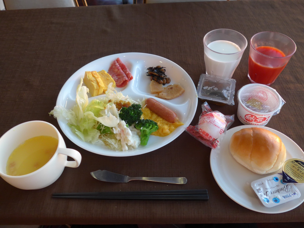 朝食がついていてホテル九階で新山口駅の建物・線路穂見下ろすように食事する事が出来ます。