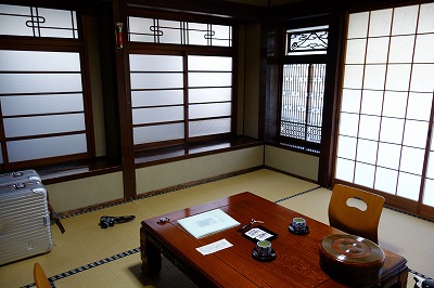 3階建ての木造建築。文化財登録された美しい宿です。夕食、朝食ともに個室でゆっくりいただきました。夕食後に外観を眺めるために外へ出たところ、古いガラスに明かりが映えて旅情をかきたてました。温泉街自体はやや寂れた感じで、夜は全く人通りがありませんでした。荷物を運んでくださった男性は笑顔が無く終始硬い表情でした。受付の年配の男性は終始にこやかで感じよい受け答え。接客態度に差を感じました。