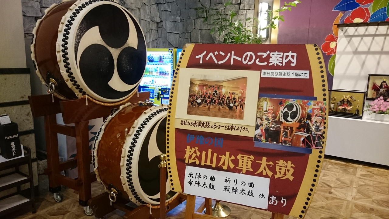 ホテルに着くと手厚く出迎えてくれて、まず感激!道後温泉温泉本館まで歩いて5分程度なので、冬でもホテルから浴衣で歩いて行けます。夕食はバイキングにしましたが、ライブキッチンのサザエのつぼ焼き、海老の塩焼き、天ぷら、ステーキなどが、とても美味しかったです。夜9時からの水軍太鼓のショーも迫力満点。ホテル内の温泉も良かったです。翌朝は、スタッフが声をかけてくれて、道後温泉駅まで車で送ってくれました。コスパは抜群だと思います。