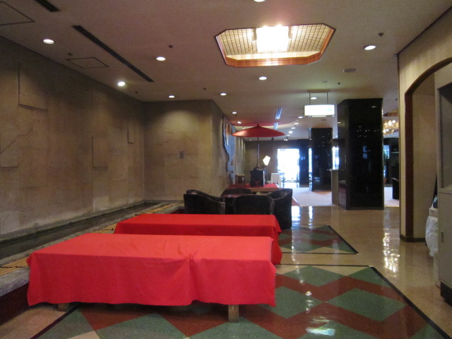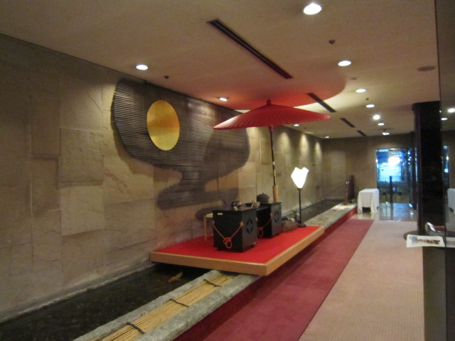 広々としたロビーには、ニシキゴイが泳ぐ細長い池があって、自動販売機の前にはソファが置かれて新聞が読め、赤い番傘や茶道具なども置いてあり、京都らしさが感じられ、風情がありました。
