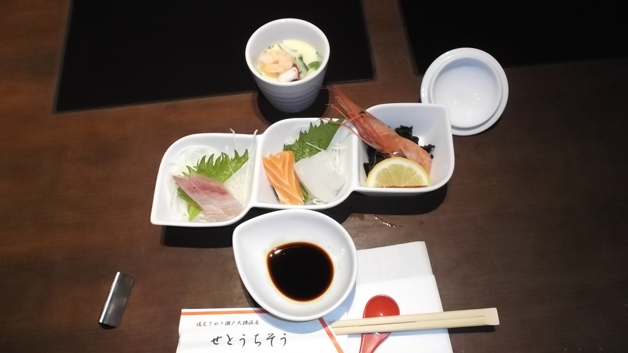 坂出駅から送迎バスでホテルへ。冷たい雨の日の送迎は大助かり。フロントで丁寧な説明を受けて部屋へ。バス・トイレなしのプランだったが、バス・トイレ付きの部屋に無料でアップグレードしてくれるサービスあり。早速楽しみな風呂へ、ぬめりのあるアルカリ美肌湯の露天風呂と夜景を楽しめる単純泉の内湯と泉質が異なるのも大いに楽しめた。