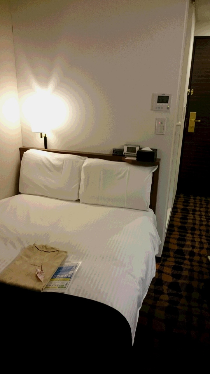 都営新宿線の浜町駅から徒歩10分くらい、隅田川沿いですが、夜だとあたりは暗くわかりづらいです。雨の日だったので探すのに苦労しました。フロントでチェックインしますが、支払いは精算機で行い、ちょっと味気ない雰囲気。ベッドはセミダブルくらいですが部屋は狭く寝るだけの部屋。風呂も狭いです。