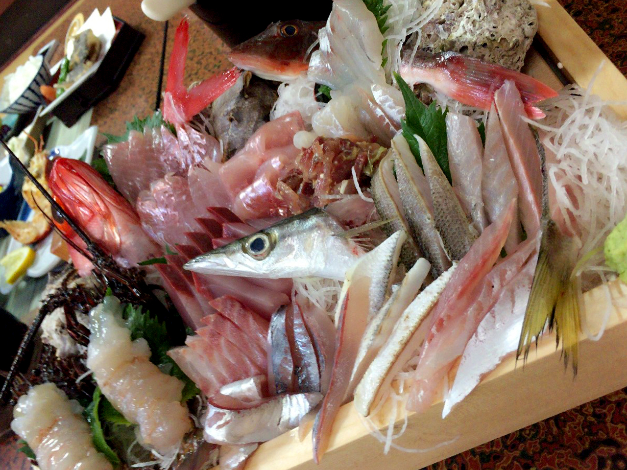 食事をしている間にお布団を敷いておいてくれます。あまり過度に構われることなく、ちょうどいいサービスです。夕食はシンプルな和食ですが、別にお刺身がついてきます。地魚のカマスやホウボウ、金目鯛や伊勢海老が出てきました。小ぶりながらも新鮮でおいしかったです。