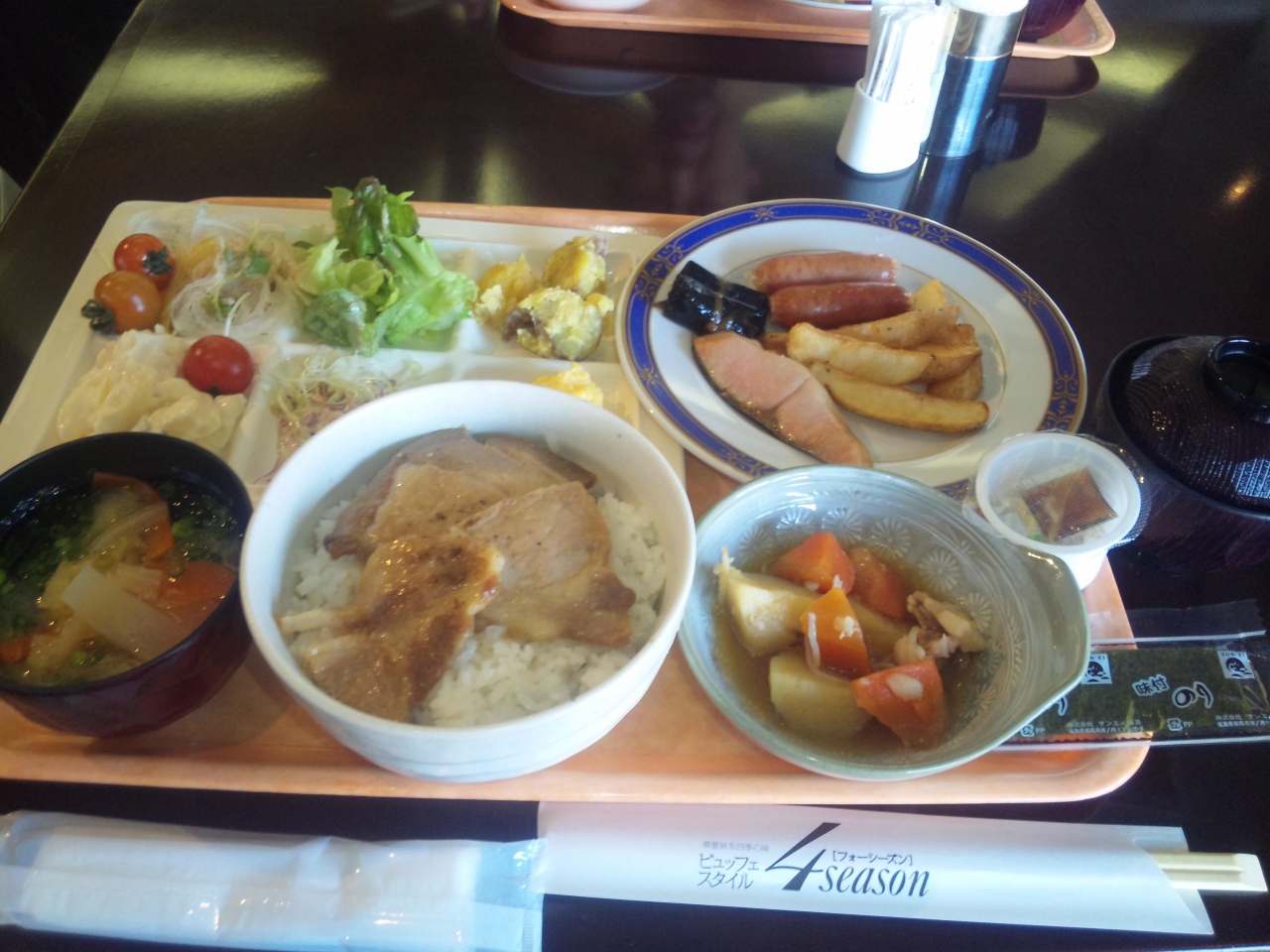 【豚丼】朝から作りました(笑)といっても焼いてある肉をのせるだけなのですが(^^;)思っていたより朝食が充実していて驚きました。