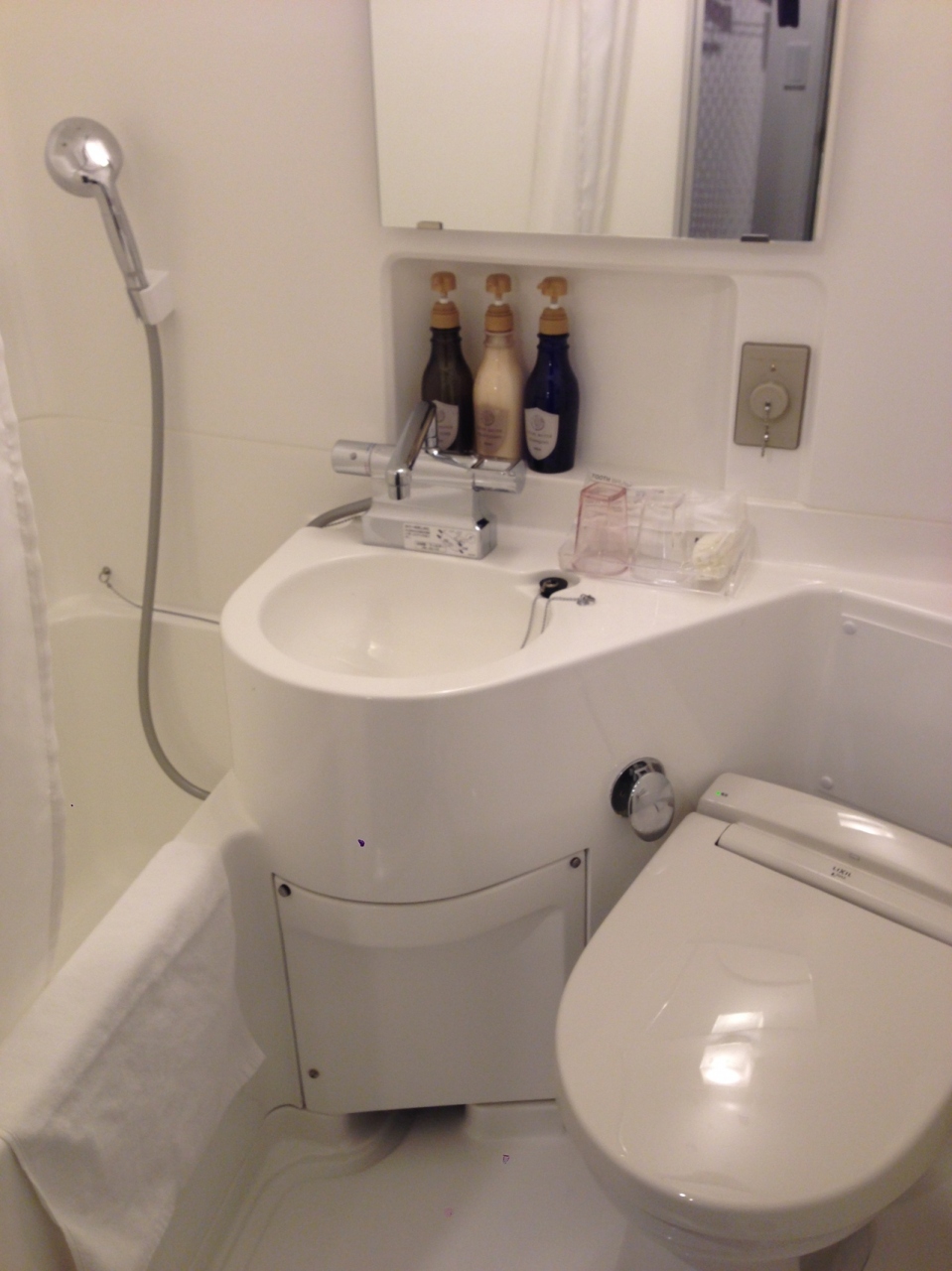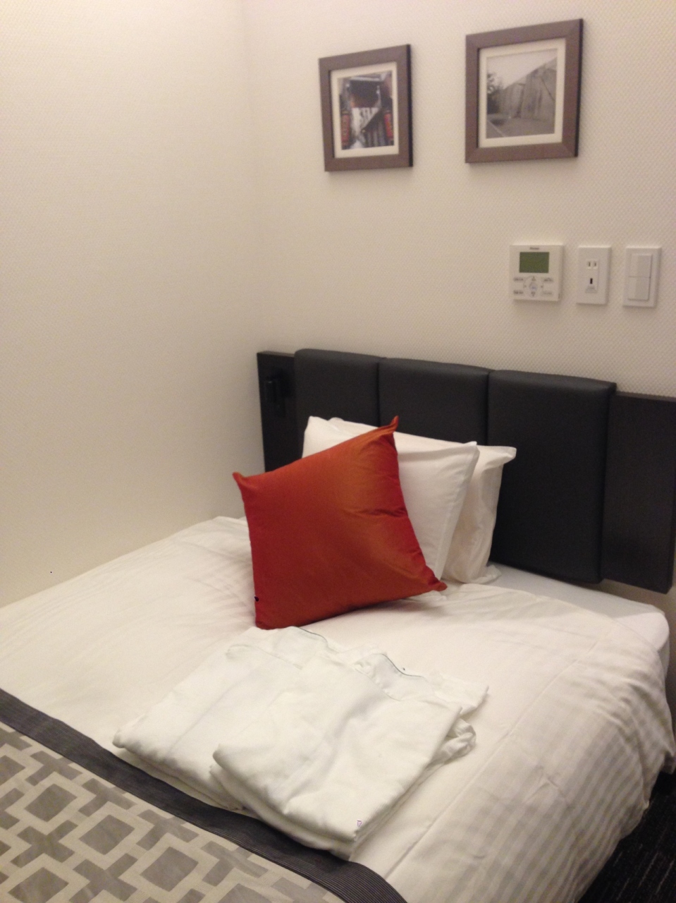現在外壁と内装を改装しているので、仮フロント、朝食会場が設けられていました。館内ではほのかにペンキのシンナー臭がしました。部屋はモノトーン色でスタイリッシュで、狭いながらも機能的にまとめられていました。