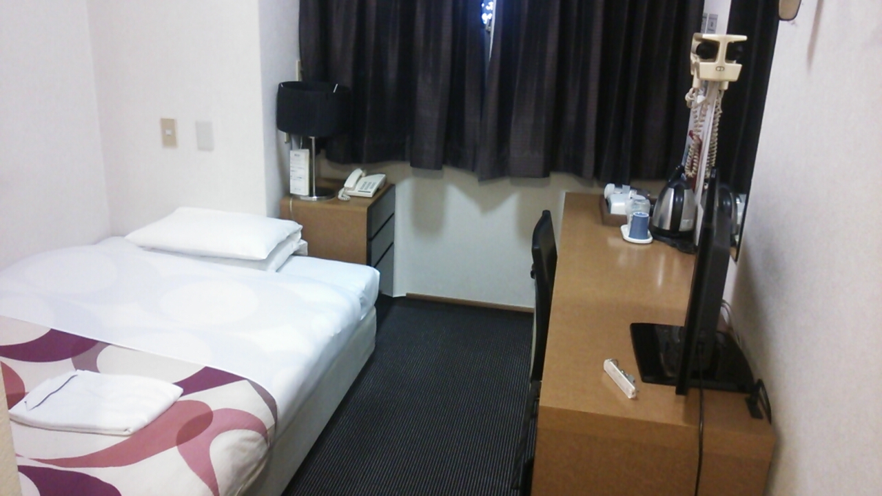 利用したのは1泊5250円する室数限定のシングルルームのプランで、客室は通常のビジネスホテルの広さとほぼ変わらないものの、ベットはダブルサイズのベットが使用されていました。