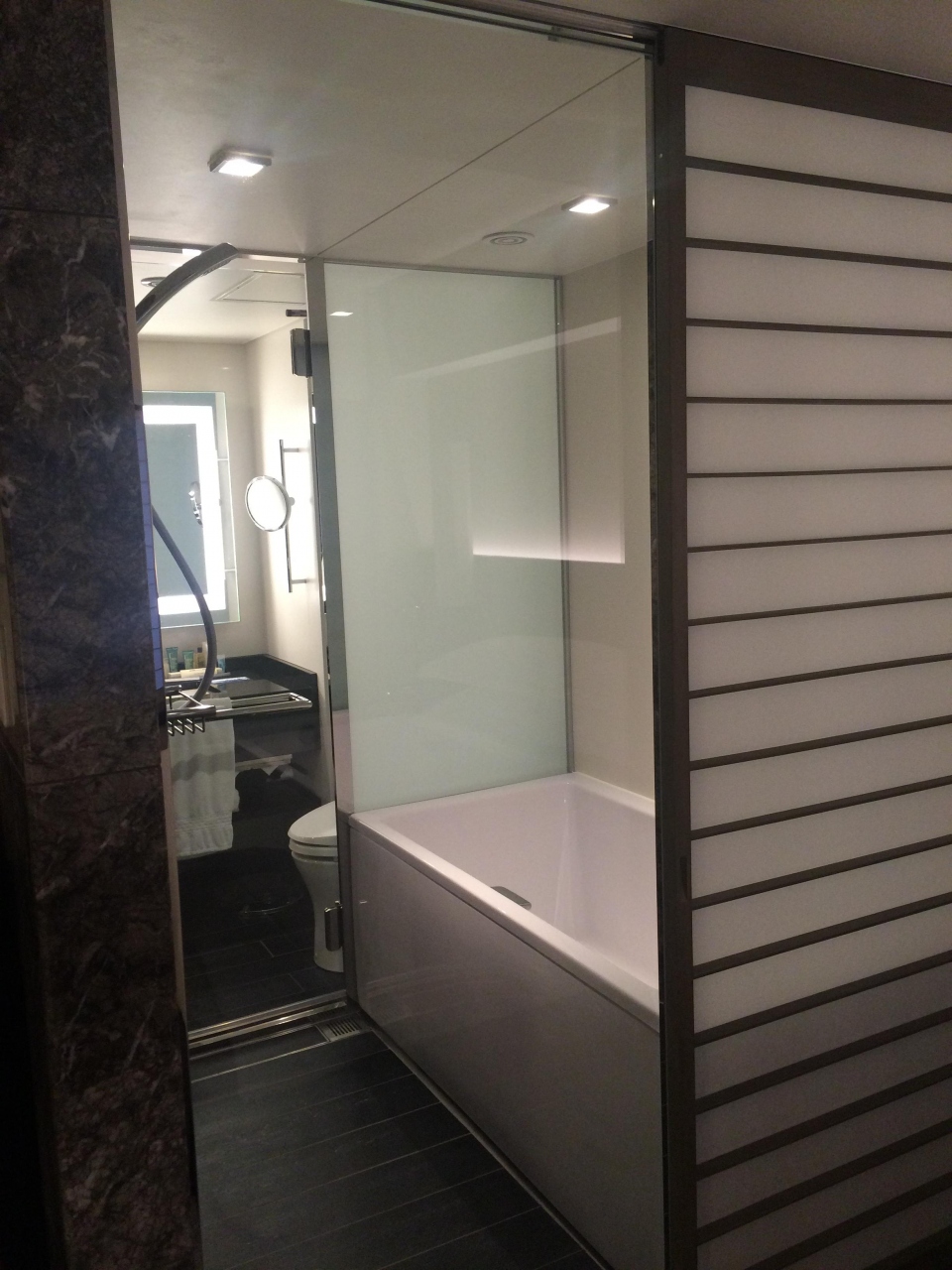 トイレとお風呂がガラス越しにお互いに見れるのはちょっとびっくり。でも最近のホテルはこんな感じですよね。ドバイのシェラトンもそうでした。