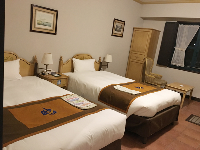 安心の「モントレ」グループ、モントレ長崎は中心部からは少し離れた場所にあります。大浦天主堂やグラバー園などの観光地に近いところなので、観光にいいかもしれません。この時はシングルで予約だったのですが、ツインに変更してくださり、ゆったりと部屋を使うことができました。客室は、長崎とゆかりのあるポルトガルをイメージしており、ツインルームはすこしカントリーテイストでした。ほとんど寝るだけだったのでもったいなかったですが、ゆっくりくつろげる部屋でした。