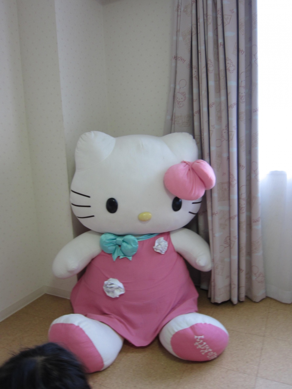鍵からキティ。部屋に入っても壁も鏡もいたるところの家具までキティちゃん!巨大ぬいぐるみまでいます。子ども用ですがお土産も盛りだくさんでした。コストは大人2の子ども2で5万とお高めはありますが、わざわざキティに囲まれに行った旅行なのでよしとしよう!です。キティ専用部屋は4つあるそうです。