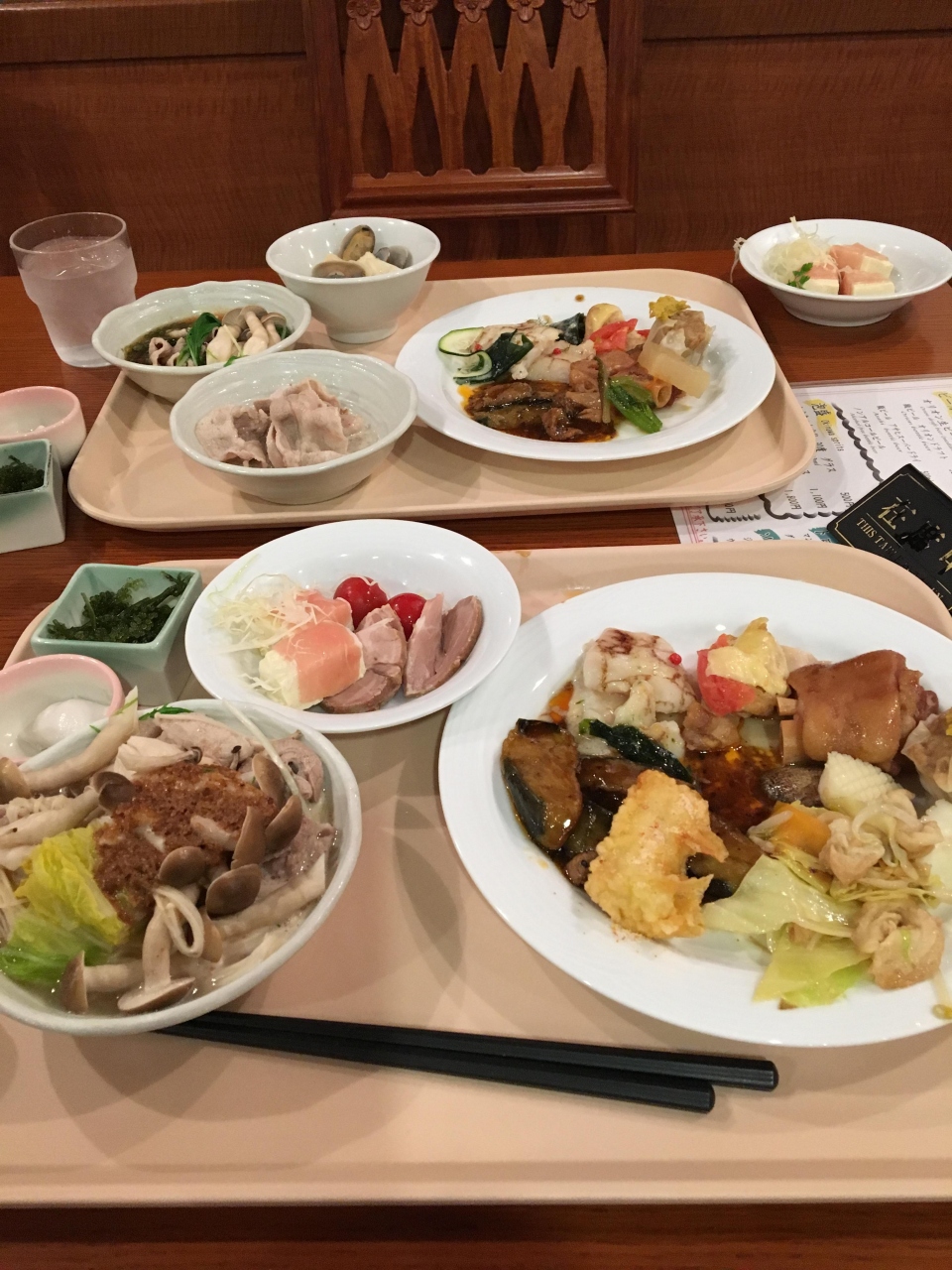 夕食ビュッフェではチビテー、モズク、海ブドウ、島豆腐、ジーマーミードーフ、沖縄そば、ぜんざいなど沖縄料理がいろいろ楽しめました。
