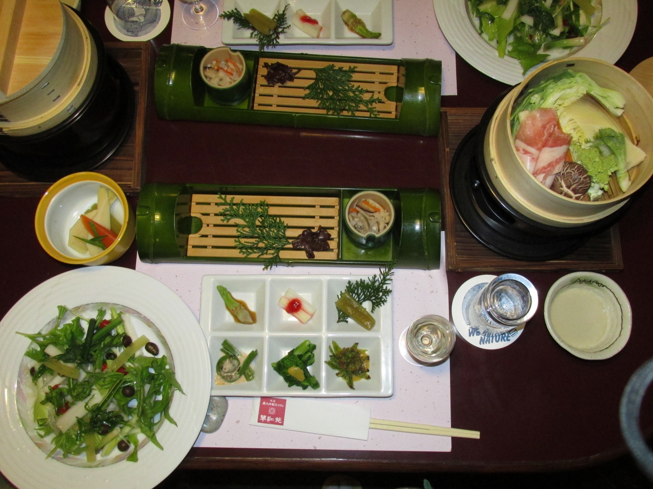 山菜づくしのプランでしたが、本当に山菜ばかりだったので驚きました。部屋から風呂までは外廊下を歩いて行きます。肌寒い3月だったので風呂上がりに冷えてしまいました。このホテルから夢のつり橋まで歩いてすぐです。