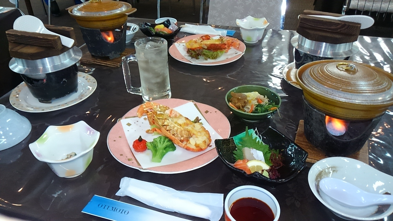 食事は夕食がハーフバイキング。メインの鍋とご飯、伊勢エビのグラタンは各自に出され、お酒とつまみものがバイキング形式。90分限定ではありますが、お酒を飲む人も大満足。