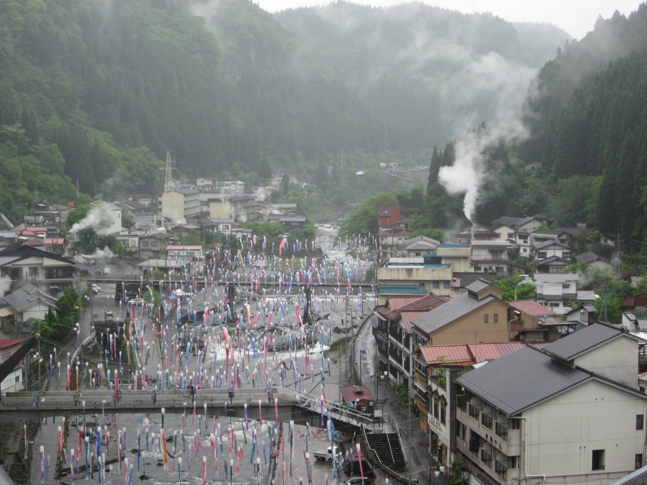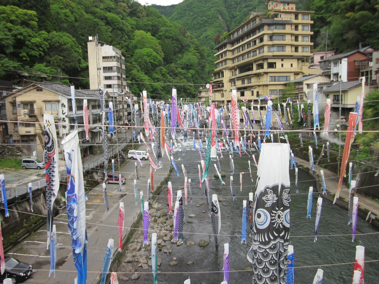 昭和の湯治場の面影を残す杖立温泉で、G・W期間中に鯉幟が渓流を泳ぐイベントがされているとのことで早々予約を入れました。
