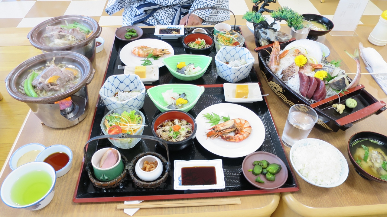 地元名物の金目鯛の煮つけと遠州夢咲牛の陶板焼きは、おいしかったですね!そしてお造りもおいしかったです。ホテルというより民宿という感じでした。1階の大浴場は、広くてのんびりできました。朝風呂は、各階にある家族風呂の利用でした。