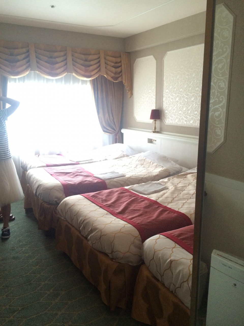 お部屋は2つのシングルベッドに2つエキストラベッドをおいた間取りで、結構キツキツに置かれていました。