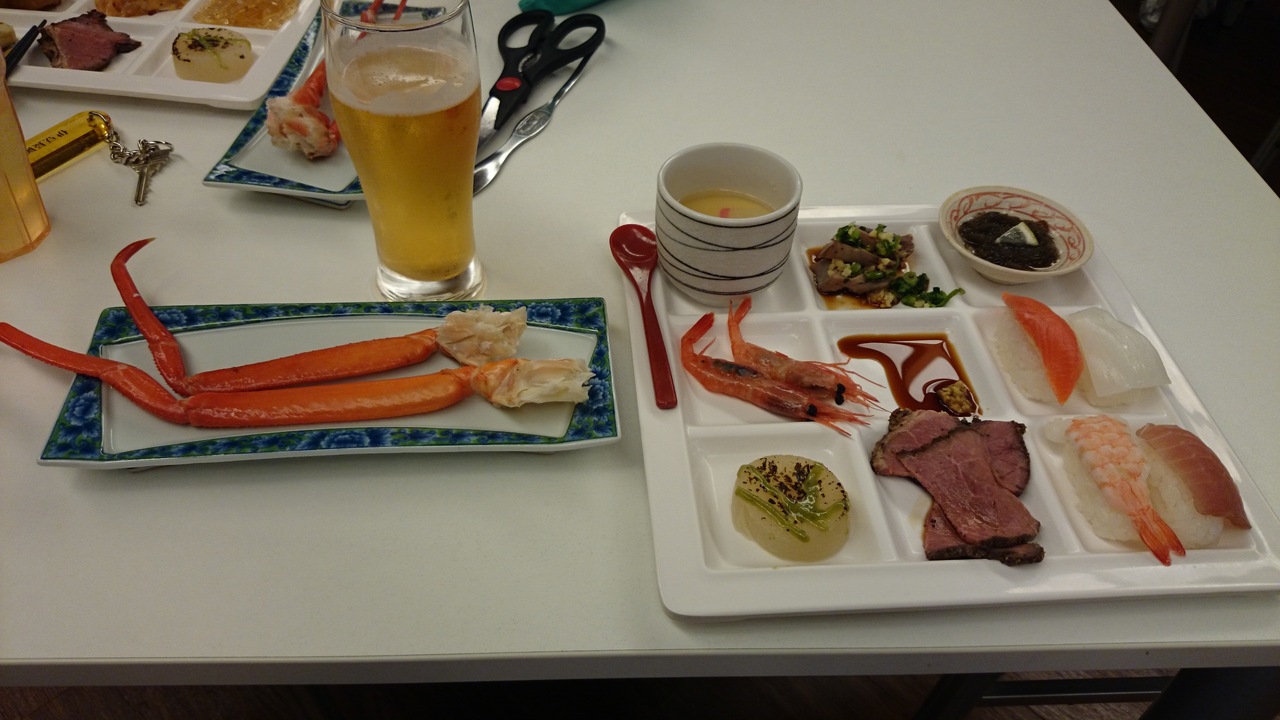 夕食はビュッフェでカニやステーキ、刺し身等の海鮮等、並ぶ料理の中には目玉の品が多々有りました。お酒は日本酒、焼酎のピッチャーがあります。