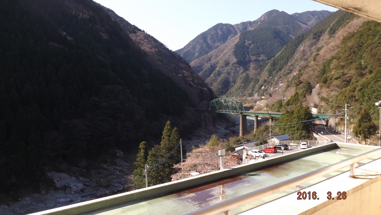 夕食の大歩危村御膳には、あめごの塩焼とぼたん鍋がでましたが、地酒にぴったりで杯が進みました。祖谷渓が眼前に広がっており、朝起きて、河原まで散歩をしてきました。青く透明な水と白い岩肌がきれいに調和して見えました。少し上流側には道の駅などもありました。