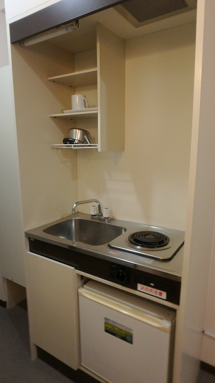 シングル客室は、ワンルームマンションを改造したような造りになっていて、キッチンと冷蔵庫がついており、長期滞在にも向いています。コンビニもすぐ近くにありました。