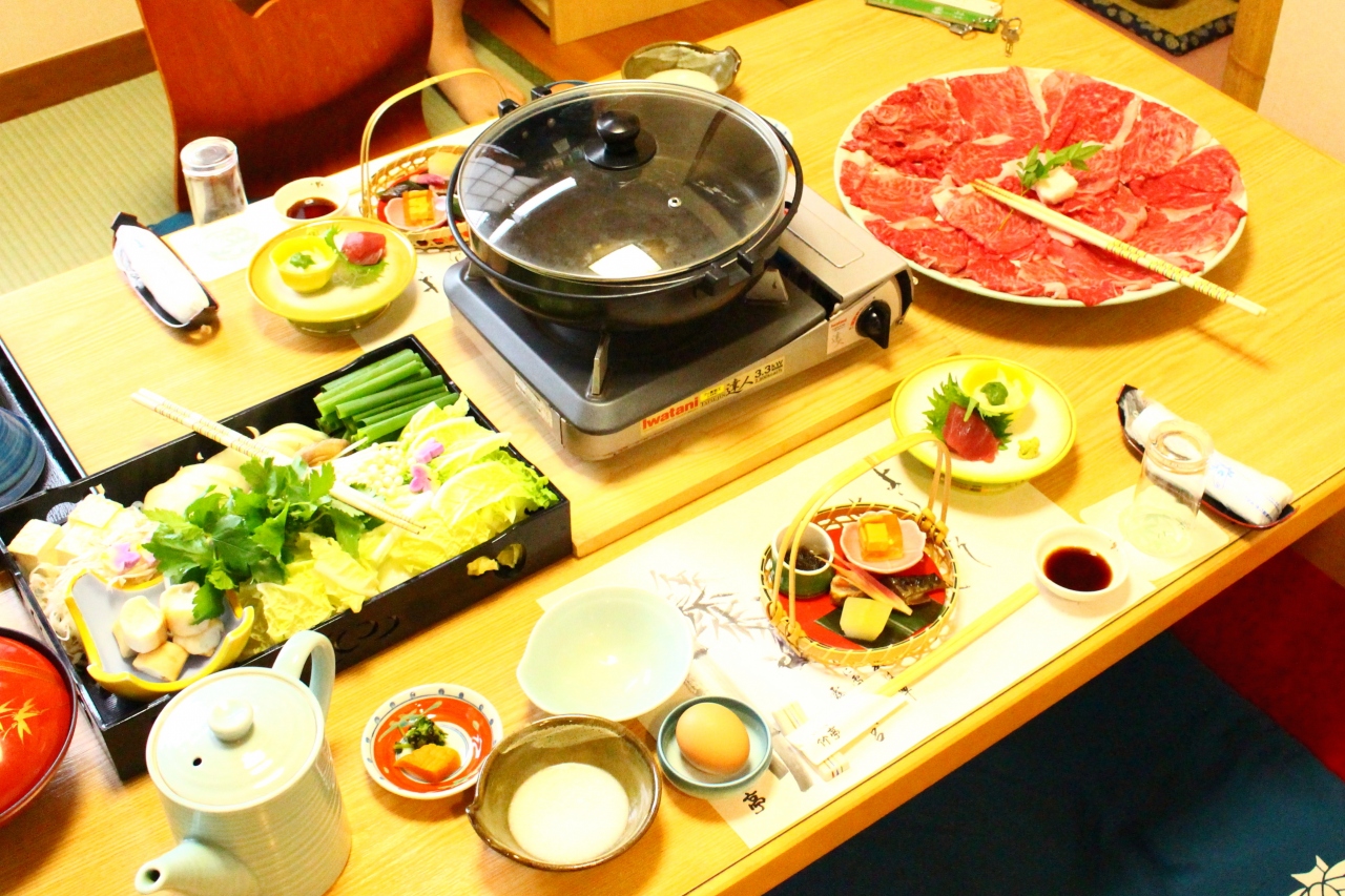 夕食のすき焼きは二人では食べきれないほどたっぷりのお肉とお野菜が用意されていました。お肉もほどよい柔らかさの上質なもの。卵のおかわり1回もできて、大満足の内容でした。