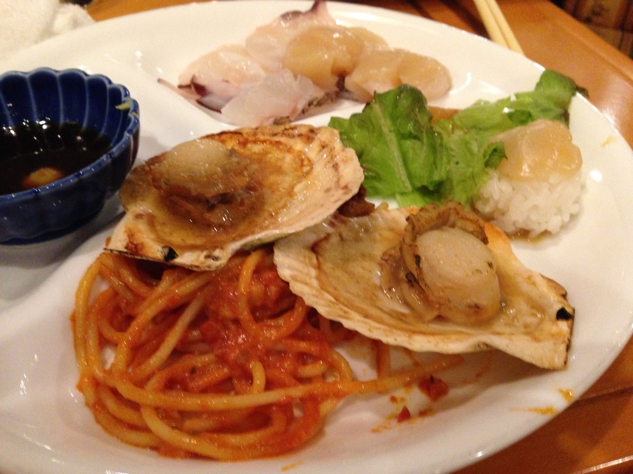 夕飯はバイキングでしたが、海鮮付バイキングだったので、新鮮な刺身、ブイヤベースが予めセットされていました。特にホタテは肉厚で甘く美味しかったです!!ブイヤベースも濃厚でとても美味しくバイキングまで手も出ませんでした。バイキングはバイキングで一品一品にホタテが入っていたりとさすが名物をふんだんに使っていると感じました。バイキングも美味しく子供も満足そうでした。夕飯の会場には子供椅子あります。ただしベルト付ではないので持参したものを使用しました。