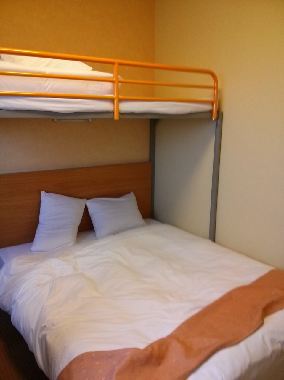 セミダブルのベッドにシングルのロフトベッド。小学生の子供二人分の朝食代¥300×2人分を含めて家族4人で泊まって1泊朝食付きで¥7,800