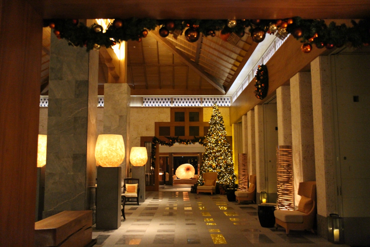 クリスマスだったので、サンタクロースがお出迎えしてくれ、部屋には支配人のサイン入りカードとぬいぐるみと小菓子も置かれ嬉しい演出が。ロビーにも美しいクリスマスツリーが飾られ、シーサー型のオーナメントがあったりととっても沖縄らしく可愛いと思いました。
