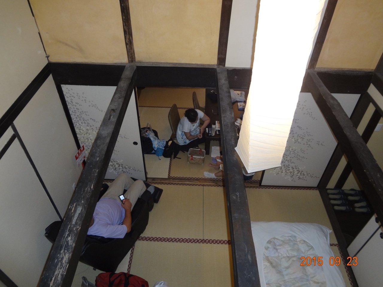 こちらには、9月23日、24日と今話題の竹田城址を見に行くのに利用しました。はな亭は「天」と「宙」がありどちらも一棟貸しです。寺子屋で受け付けを済ませ、車を駅前の駐車場に置いて歩いて「天」へ。4人で丁度いい広さです2階はベッド、天井は低いです。