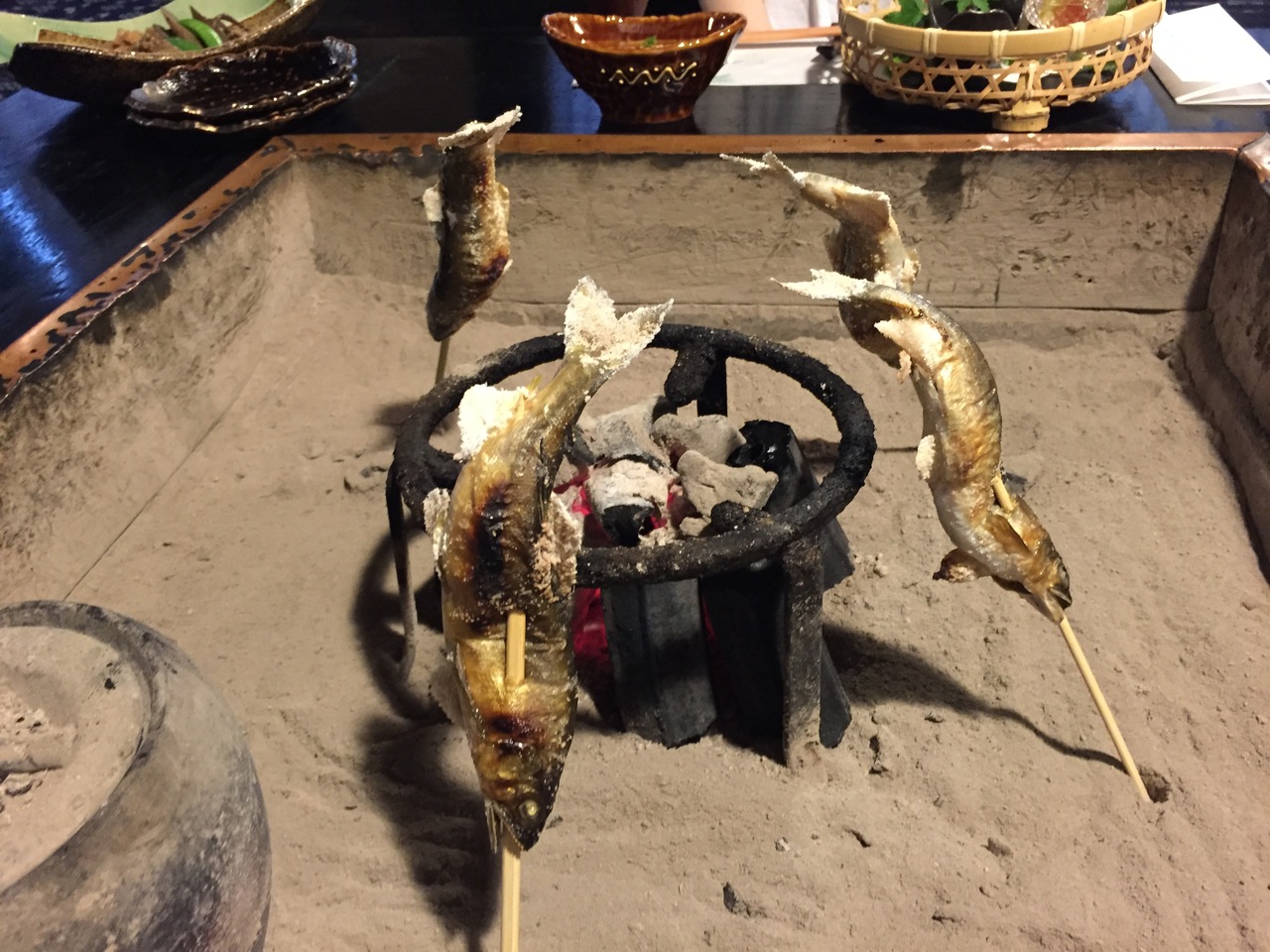 夕食は囲炉裏で地元の赤牛や鮎を焼きながら食べるスタイルで楽しめる。