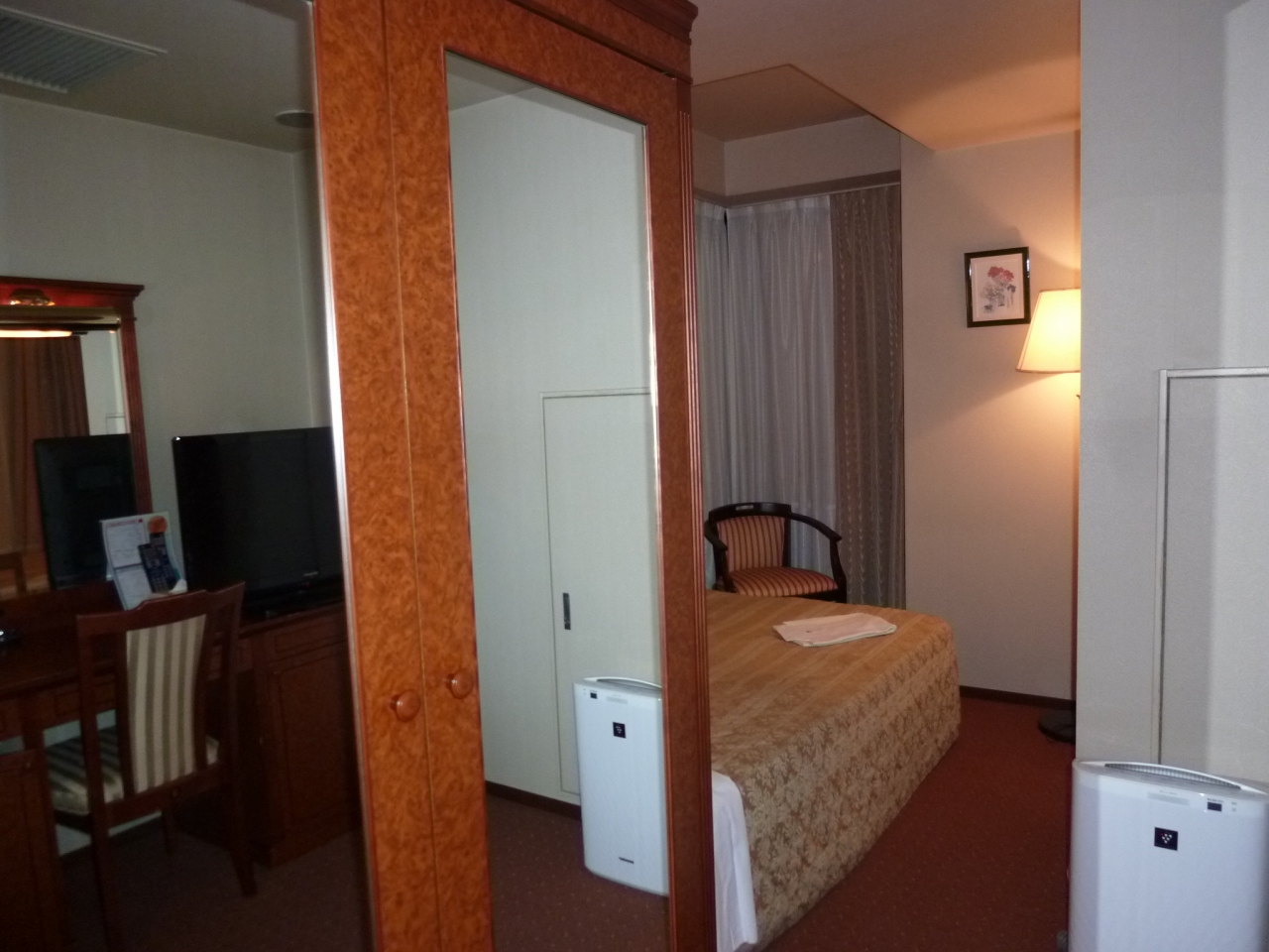 夜遅い11時のチェックインにも拘わらず丁寧に向かえて頂き、しかもレディースルームになっていました。部屋にはアメニティーと加湿空気清浄器、旧式のフットマッサージ機(ローラー回転式)があり、歩き疲れた足をほぐす事ができました。この部屋は造りが変わっていてひょうたん型になっていました。照明が暗いので仕事には向かないと思いますが寝るだけなので十分です。