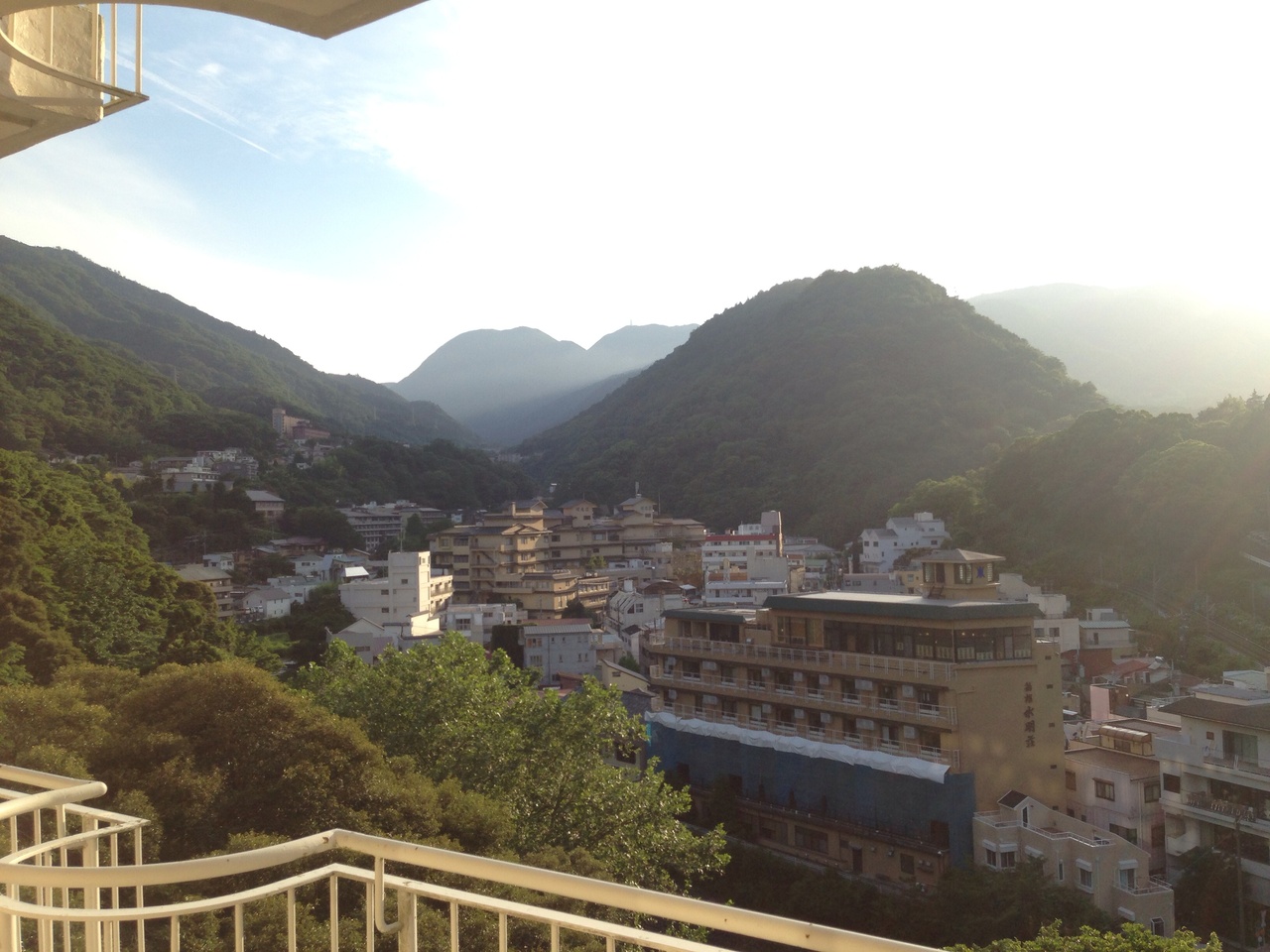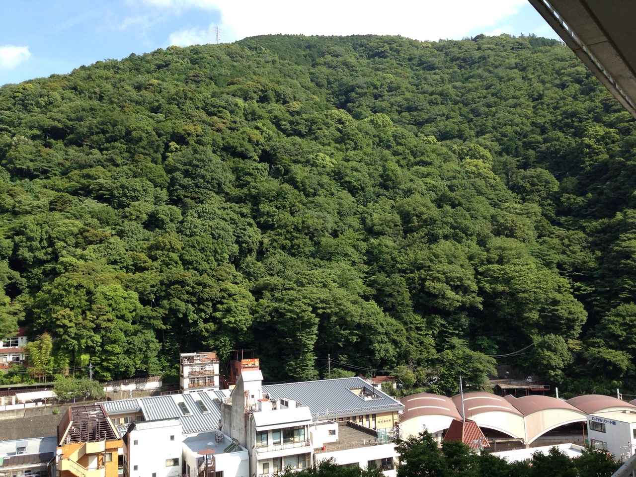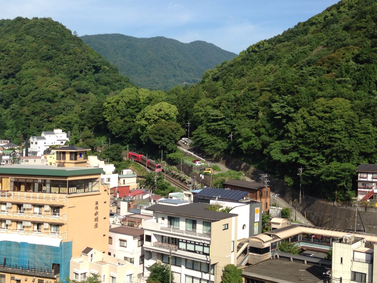 お部屋の広々とした窓からは、川と、その向こうの緑麗しい山々がのぞめ、(昨年秋に利用した時は、美しい紅葉を堪能できました)湯元駅のホームを出入りするロマンスカーや、湯本駅出てすぐの急勾配をぐんぐんと登って行く登山鉄道の勇姿も楽しめ、鉄道ファンの息子はおおはしゃぎでした。
