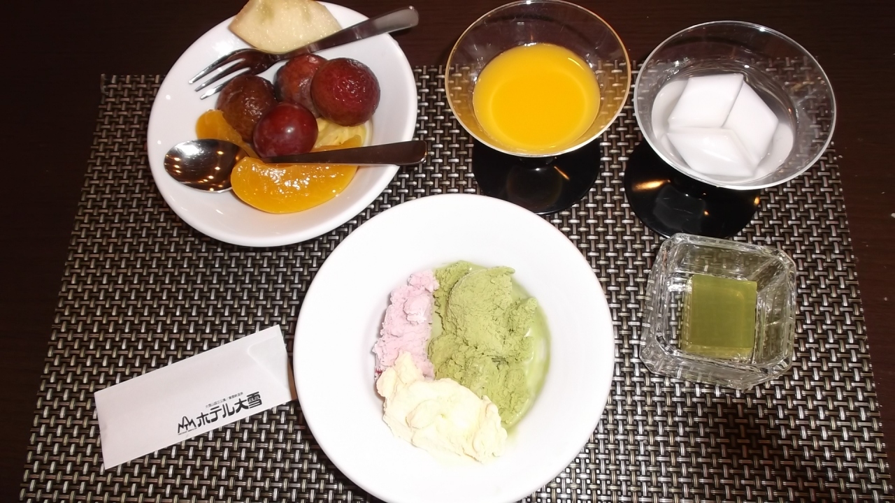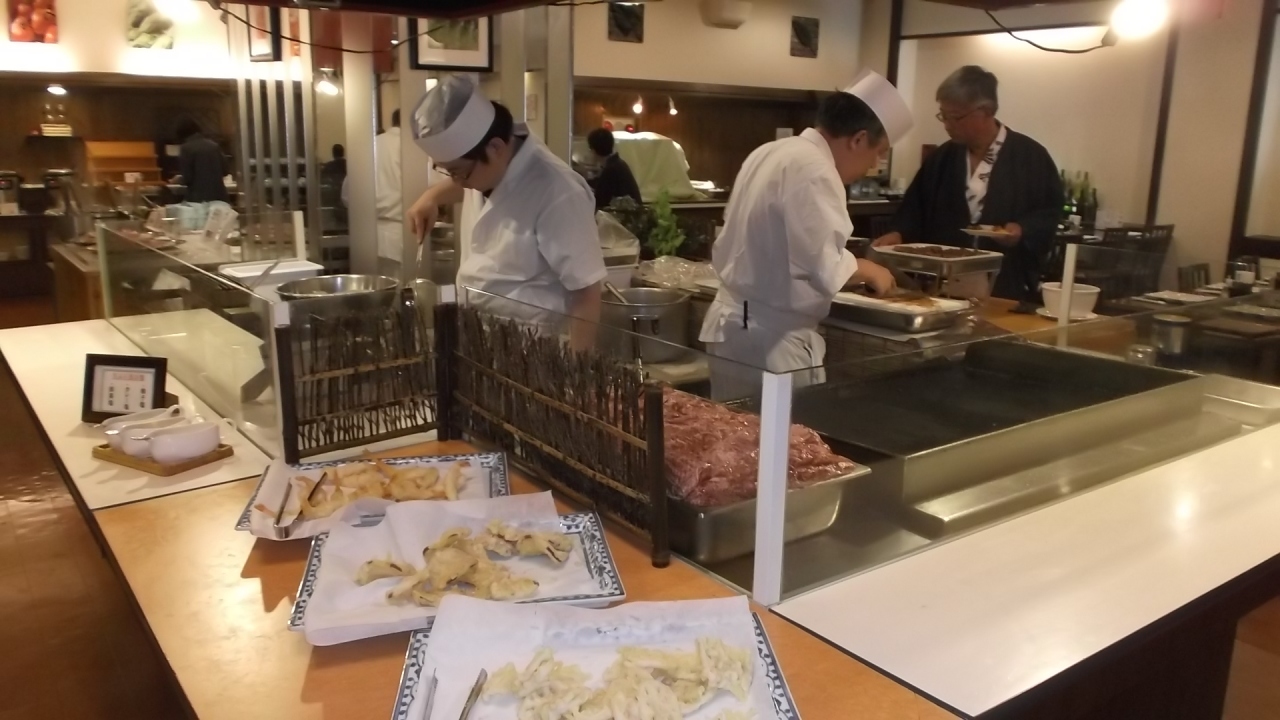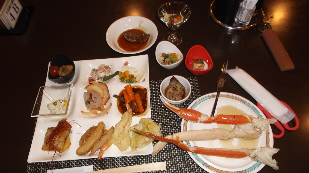 夕食はレストラン石狩で、超豪華バイキング…天婦羅とステーキの実演がありずわい蟹がテーブルに山盛りに盛られていた。他、豚シャブシャブ、海鮮陶板焼き、小皿盛各種、さらにデザート・フルーツ・アイスなどとてもメニューが豊富で食べきれない種類に大満足でした。クーポン利用で8630円(税・サ込)は格安でした。