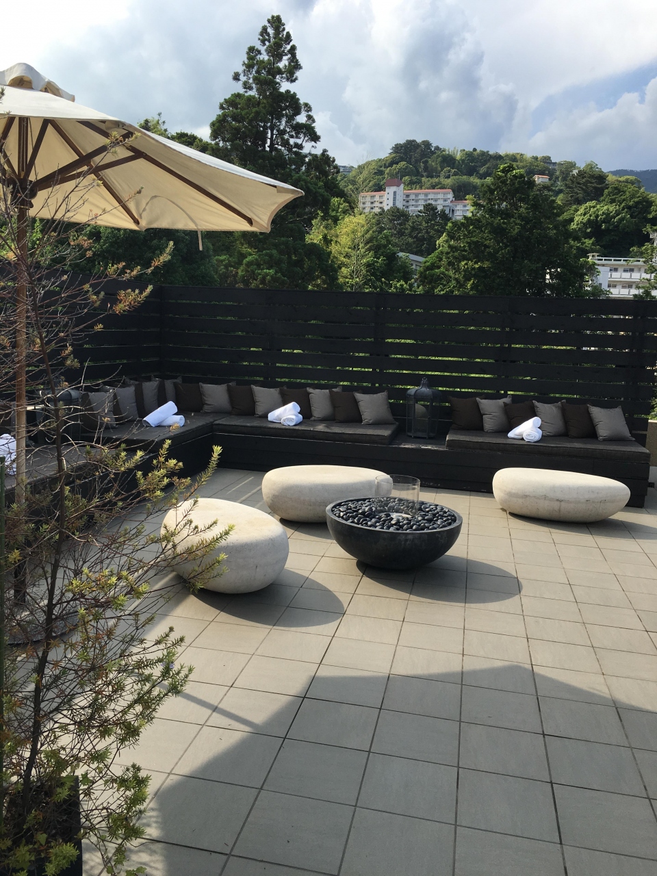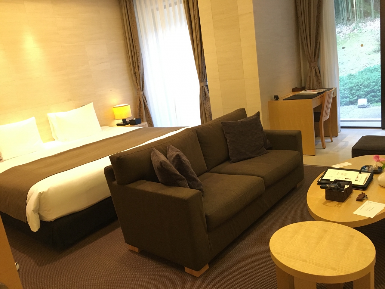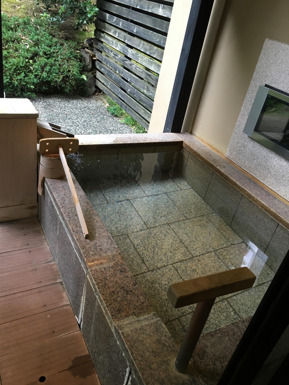 部屋は明るくモダンな作りで、露天風呂にはテレビもついています。