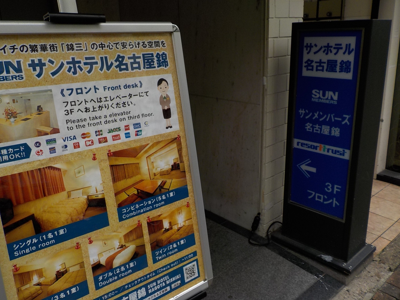 名古屋錦の繁華街にあるホテル。色んな飲食店お店の看板があって、なかなか見つけることが出来なかったのですが見つかりました。ホテルのエントランスは、3階になるので、ホテルの入口からはまずはエレベータで上がります。繁華街の中なので、1階からアクセス出来ないのが、逆にセキュリティが良くなっていました。