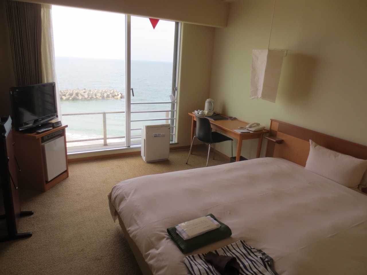 今回泊まった部屋は5階の洋室。シングルとはいえベッドはダブルかと思うほど横幅があり、部屋には浴室がないせいか、平米数よりかなり広く感じる。淡い落ち着いた色合いで統一されたインテリアは好感が持てました。窓からは目の前に広がる日本海がよく見渡せたのもポイント高し。