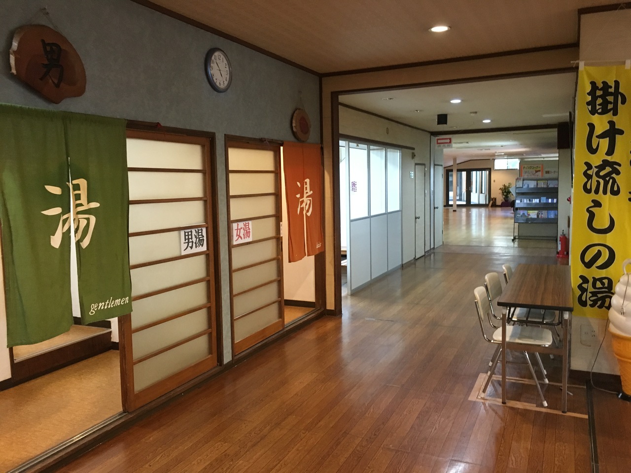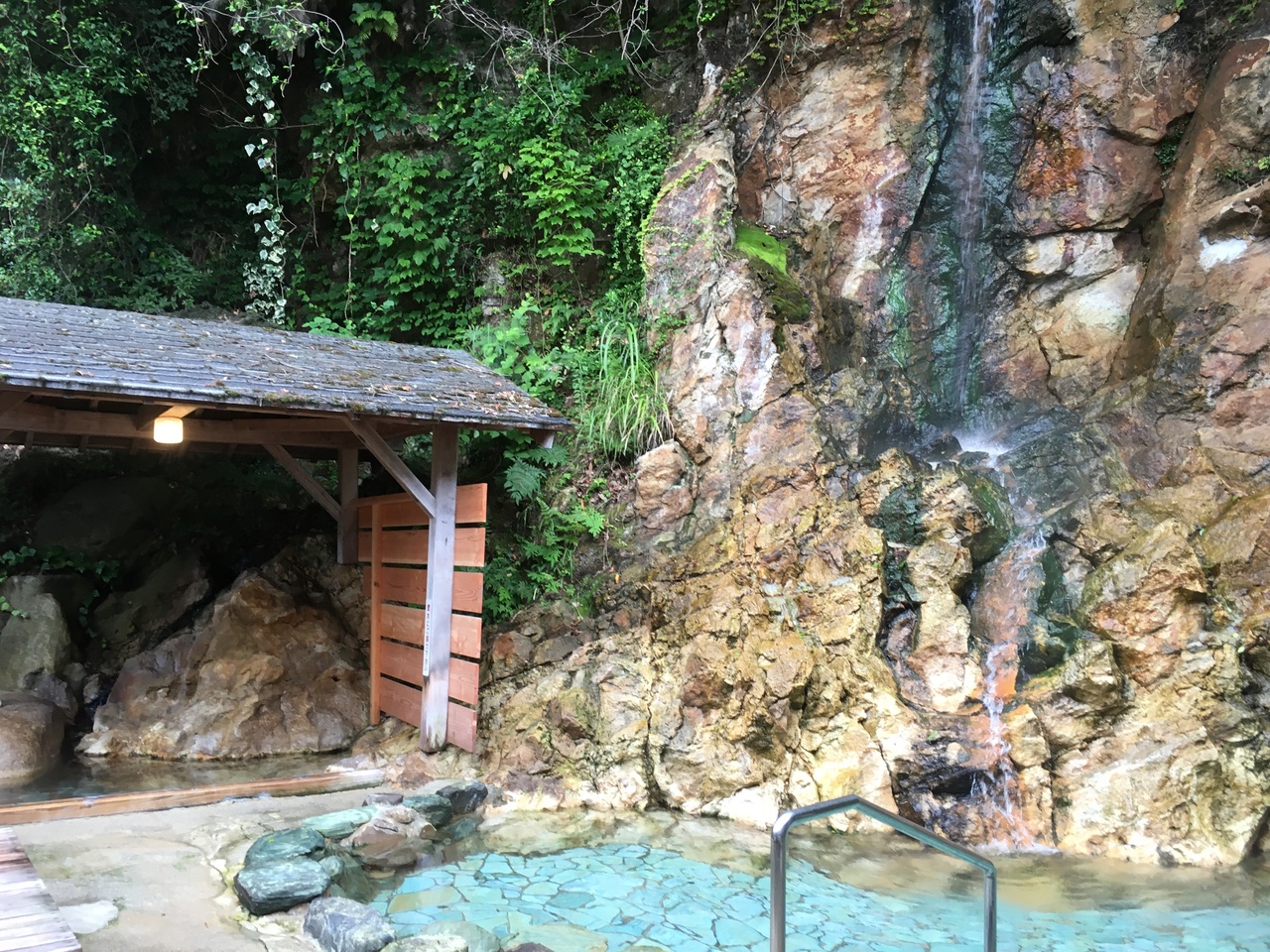 男女ともに大きな露天風呂がありました。かなり大きな岩から温泉が流れ落ちてきます。露天風呂の一部がジャグジー的にもなっていました。カルシウムナトリウム塩化物硫酸塩泉と表示がありました。古くからある温泉で、温泉の質も高いですが、その分施設は古いです。