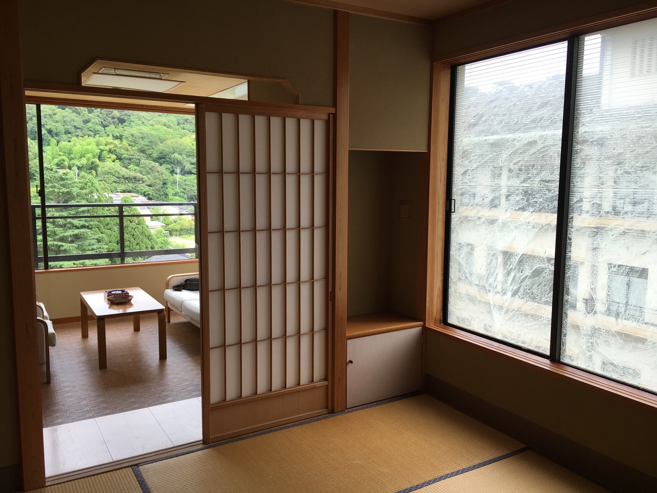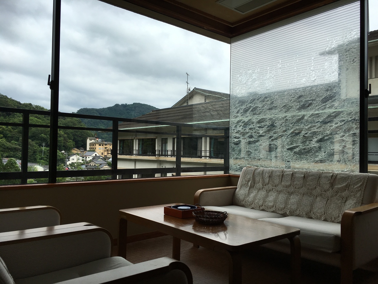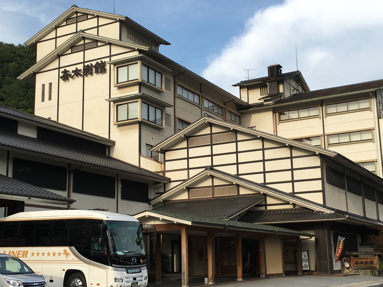 ホテルは川側ではなく、山側にありました。中庭もあり、三朝の中でも、規模の大きい旅館でした。