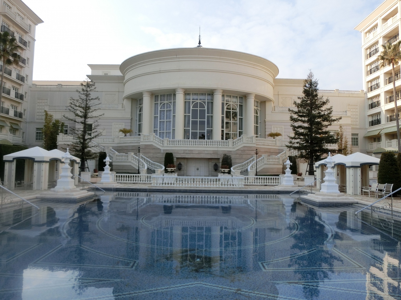 浜名湖畔の何もない場所に「白亜の御殿」が建っています。それがエクシブ浜名湖で、外観も館内も白で統一されています。ホテル玄関までのアプローチがなかなか良く、豪華リゾートの雰囲気を盛り上げてくれます。