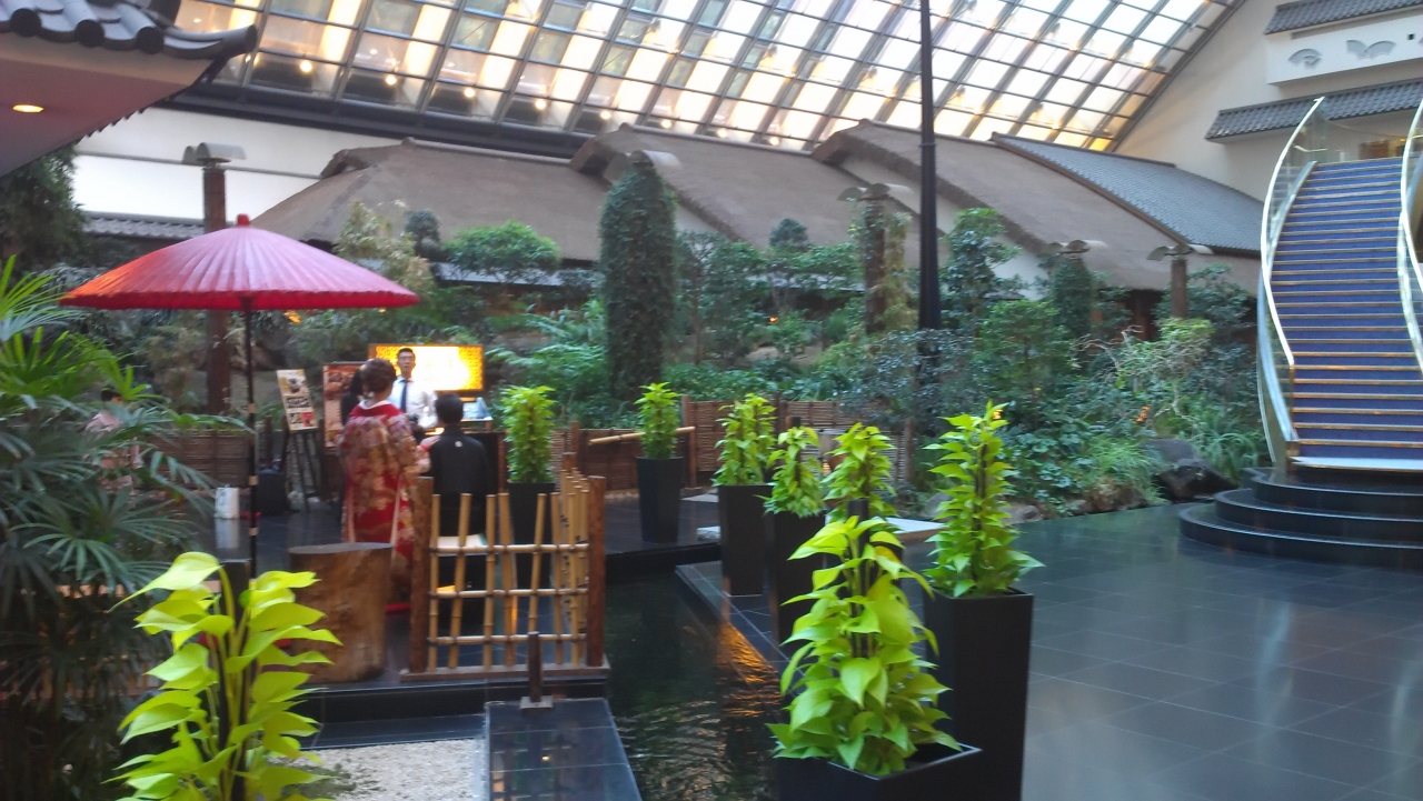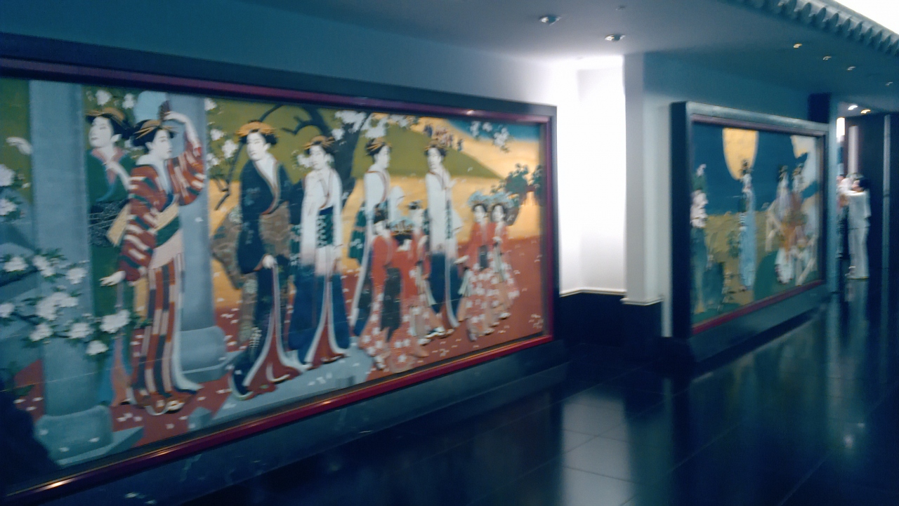 木造から洋風の新しいホテル形式に建て替えられてずいぶんたちますが、昔の木彫板や漆芸壁画絵は保存されて通路に展示されています。庭園の見えるホールも木々と調和していて、新旧がうまく和合している感じです。