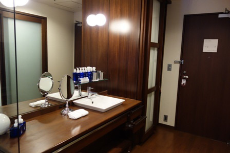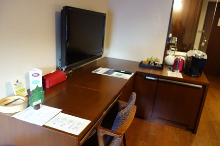広めのデスク兼ドレレッサーと冷蔵庫。冷蔵庫にはお水とウェルカムドリンク的なチョコレートティーが入ってました。チョコレートティー、お洒落でチョコレートの香りがするけど、味はハーブティーに似ていて甘さはありませんでした。コーヒーマシンはドルチェグストで、1杯づつ簡単にコーヒーを入れる事ができます。