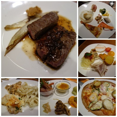席に案内されるとまずは前菜が運ばれてきます。運ばれてくる前にお料理を取りに行ってもかまわないようです。レストランはとても混雑していますが、お料理の補充も早いし食べ終えたお皿の回収も早かったです。お料理もとても美味しかったです。実演のステーキや自分好みのトッピングでピザが焼けたり、デザートのケーキもロビー売店で売っているほどなので、とても美味しかったです。