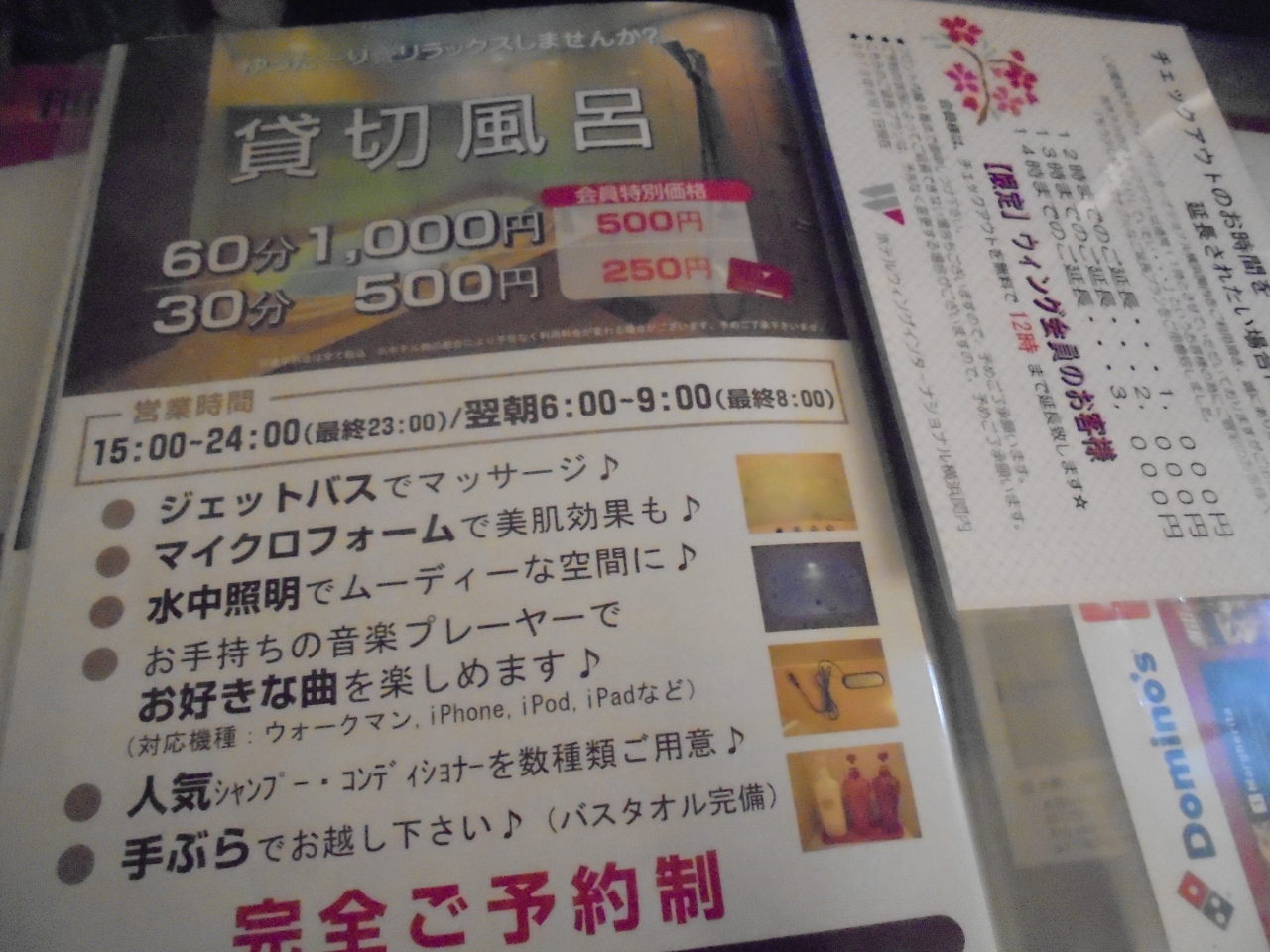 デイユースで利用。他の方の口コミで古くて部屋のユニットバスがとにかく小さいとありましたので有料でしたが貸し切り風呂利用してみました。1000円ですがポイントでも入れ会員だと1時間500円。1000円では高い気がしますが500円ならありです。30分だと会員は250円。