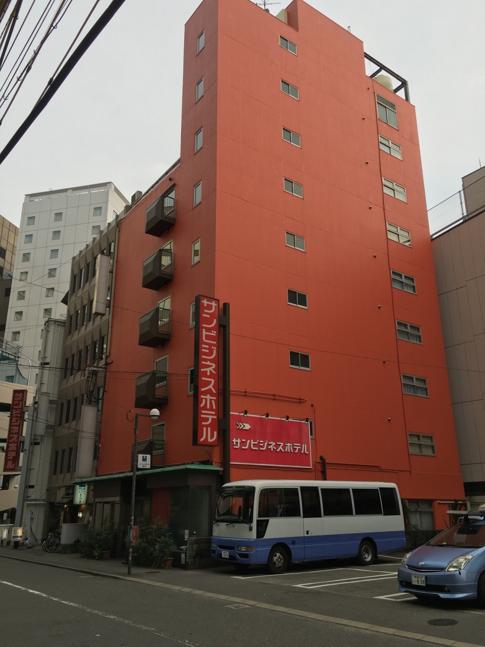 福岡出張の際に利用しました。博多の駅から歩いてすぐの場所にあります。建物が目立つ色なのですぐに分かりました。かなり古い建物でしたが、清潔な感じがしました。変な匂いもしません。お部屋のドアは軽い感じで音が結構漏れてきそうな感じです。3階に泊まりましたが、あまり宿泊者が居なかったのか、静かでした。お風呂はユニットで狭いですが、普通な感じですね。ベッドも固めで満足です。ネット予約はカードが使えないのが、ちょっと不満ですかね。また空きがあれば利用したいと思います。
