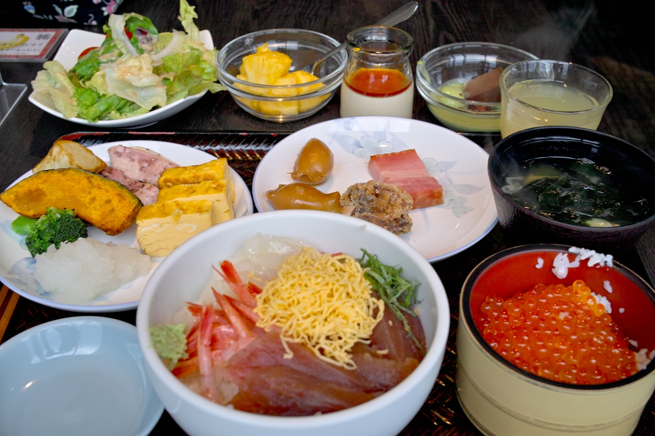 評判の朝食はさすがの内容でした。きれいなイクラやイカ・甘エビなどが食べ放題です。特にイカが甘くて美味しかったです。