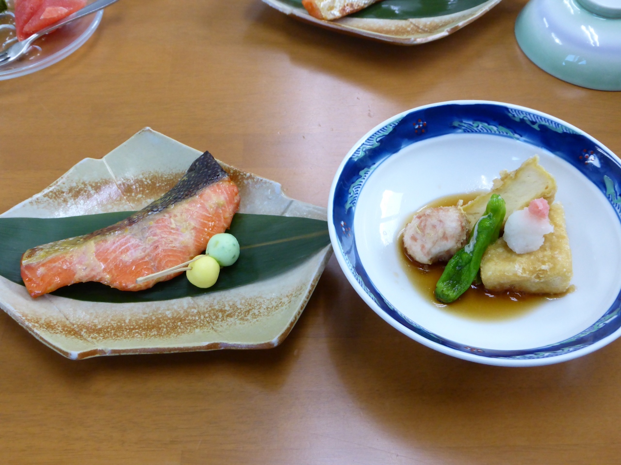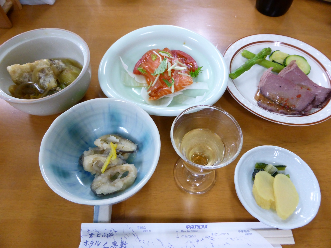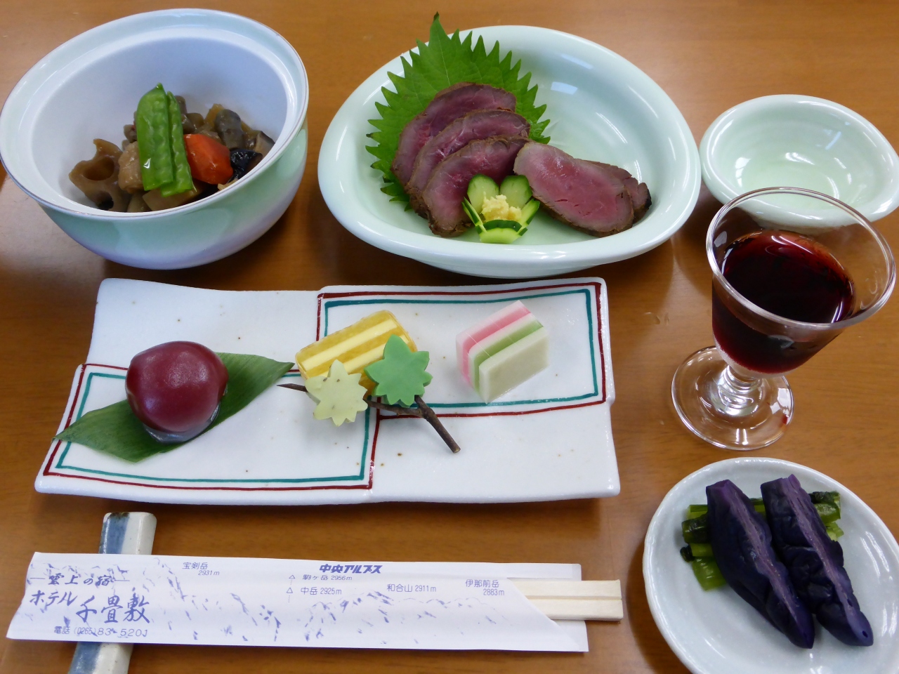 食事は食堂でいただきます。初日はサーモン刺身、アマゴ胡麻味噌焼き、ローストビーフ、豚ロース味噌鍋など。2日目は桜肉たたき、サーモン西京焼き、牛肉陶板焼きなどです。味付けは少し濃いめで特別おいしいものはありませんでした。山の上なのでそれで御の字という考えもあるでしょうが、ロープウェイで食材も上げることができ、かつこの金額ということを考えれば、少し割高に感じます。立地は良く、早朝誰もいない登山道をゆっくり登れることや、ご来光(8月上旬だとまだ見れない)や朝焼なども見ることができるので、その分という事でしょうか。