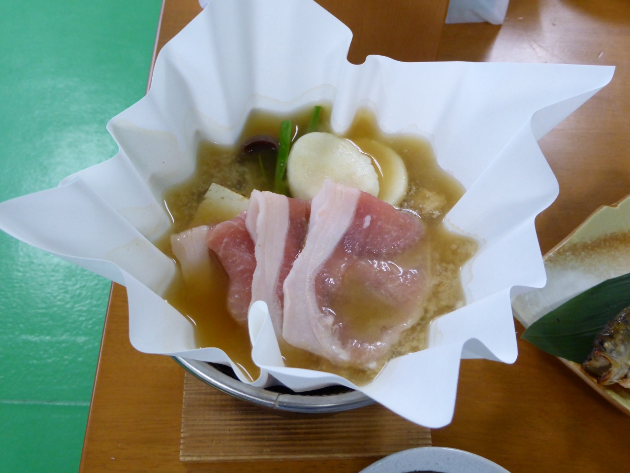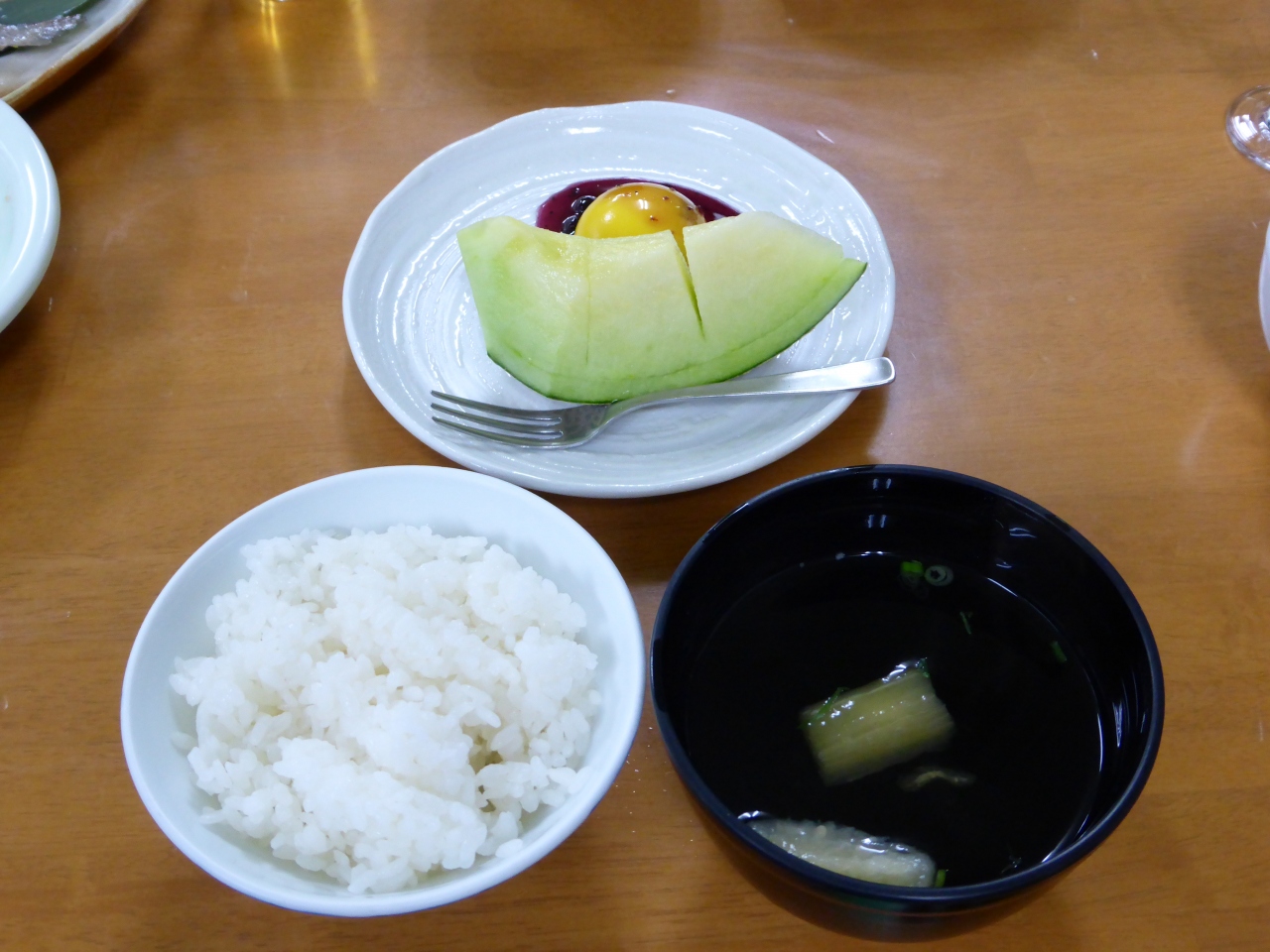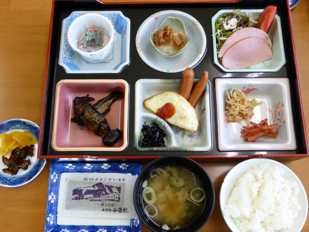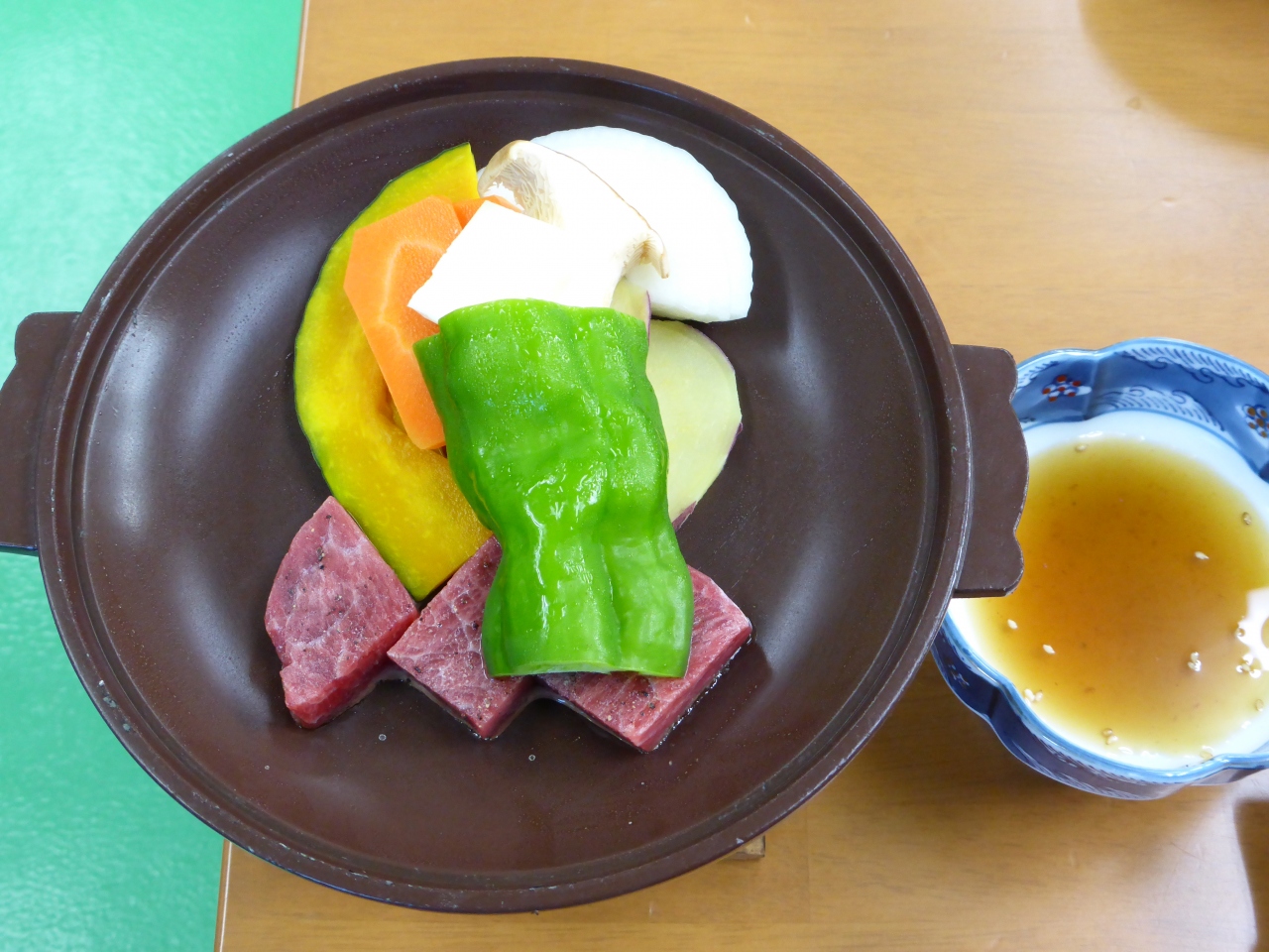 食事は食堂でいただきます。初日はサーモン刺身、アマゴ胡麻味噌焼き、ローストビーフ、豚ロース味噌鍋など。2日目は桜肉たたき、サーモン西京焼き、牛肉陶板焼きなどです。味付けは少し濃いめで特別おいしいものはありませんでした。山の上なのでそれで御の字という考えもあるでしょうが、ロープウェイで食材も上げることができ、かつこの金額ということを考えれば、少し割高に感じます。立地は良く、早朝誰もいない登山道をゆっくり登れることや、ご来光(8月上旬だとまだ見れない)や朝焼なども見ることができるので、その分という事でしょうか。