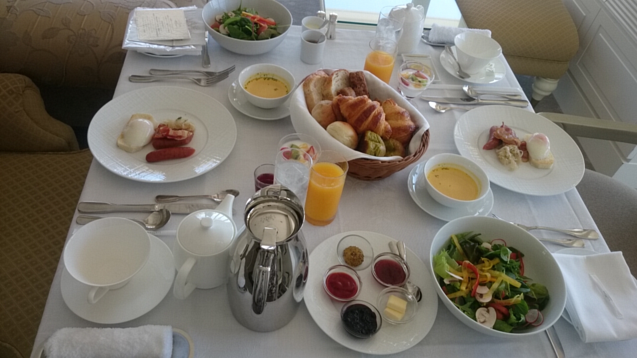 時間があったらお部屋でアフタヌンティーをしたかったのですが、スパに行ったらディナーの時間まであまりなかったので断念しました。ディナーは、ル・クールでいただきました。事前に予約していたので、ポートタワーのよく見える前列の席を準備していただきました。お料理はどれもとても美味しくて、最後のスイーツはワゴンサービスだったので沢山いただきました。レストランの目の前では、9月までビアガーデンをやっていて、団体様で賑わっていました。朝食は600円弱を追加して、ルームサービスにしてもらいました。パンの種類が豊富で、特にクロワッサンがサックサクでとても美味しかったです。お持ち帰り用の袋もうれしいサービスですね。フロントとロビー、中庭は、想像以上にコンパクトでした。ホテル内では、ホテル内で使用している物(アロマやクッキーなど)以外のお土産売り場などはありません。加湿器は部屋に常備していなくて借りましたが、とても小さいので3時間しか持ちませんでした。1泊でしたが、とてもゆっくりできて楽しめるホテルだったので、次回神戸に行く機会があればまた同じお部屋に泊まりたいです。