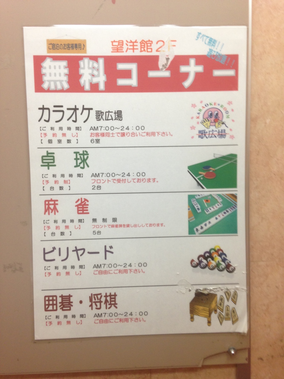 その他の館内施設としては、カラオケ、ビリヤード、卓球、囲碁将棋コーナーがいずれも無料で、しかも受付なしで自由に使えるので、ちょっとカラオケでも…という感じで風呂の帰りに寄れたりします。