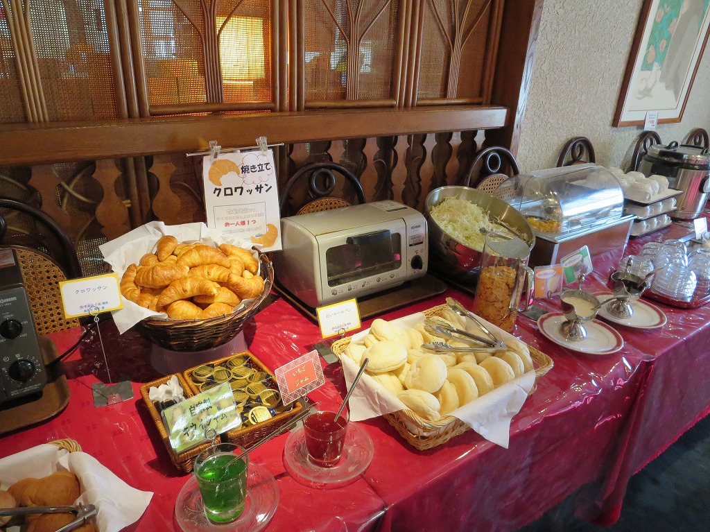 朝食は普通に準備されています。焼きたてクロワッサンはお一人様一個限りです。その他2種類のパンが準備されています。野菜はキャベツの千切りのみです。